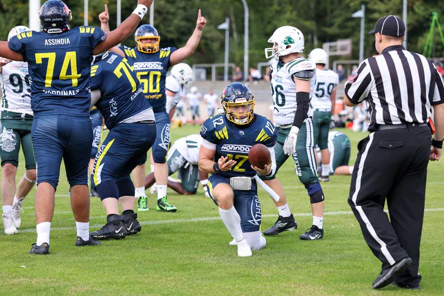 „Wir haben uns trotz des ständigen Rückstandes in der ersten Halbzeit nicht von unserem Weg abbringen lassen, die Ruhe bewahrt und hinten heraus ganz starken Football gespielt.“
