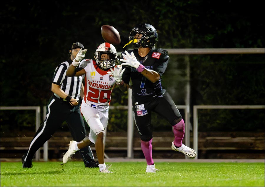 Am Ende waren es Kleinigkeiten in beiden Spielen, die den Unterschied machen. So fiel das Fazit von Cheftrainer Connor Shannon nach der Partie aus, der trotz der beiden Niederlagen in der Relegation zurecht stolz auf sein Team war. Und tatsächlich war vor allem ein eigener Fehler der Sentinels im ersten Quarter der gefühlte Unterschied in der Partie mit den favorisierten Gästen. Von Beginn an zeigte vor allem die Defense eine konzentrierte Leistung und hielt den Angriff der Centurions gut im Griff. Doch bei einem Punt Return, sprang der Ball einen Bad Homburger ans Bein und von dort in die Endzone, in der das Leder-Ei von einem Gäste-Spieler recovert werden konnte - 0:7 aus Sicht der Wächter. Der Angriff um den wiedergenesenen Liam Müller brauchte etwas, um in Fahrt zu kommen. Bis es soweit war, erhöhten die Augsburger bereits auf 14:0 nach einem langen Drive. Doch vor der Halbzeitpause dann das Lebenszeichen. Einer der besten Drives der Saison endete mit einem Darion Neal Touchdown-Run. In der zweiten Halbzeit weiterhin beide Defensiv-Reihen mit dem besseren Start, doch ähnlich zum ersten Abschnitt, legten die Centurions wieder vor. Bad Homburg biss sich bis tief ins vierte Quarter die Zähne aus, mit 1:25 verbleibender Spielzeit dann aber doch der Anschluss. Rashad Greene auf Aaron Seward und mit Extrapunkt nur noch 14:21. Doch der Onside Kick landete bei Augsburg, die mit einem weiteren First Down, die restliche Spielzeit runterlaufen lassen konnten.