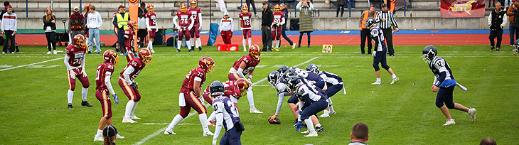 U16-Oberliga West: Typhoons und Jets liefern sich packendes Duell auf Augenhöhe Das letzte Heimspiel der U16 TFG Typhoons im Rather Waldstadion hatte alles, was ein gutes Footballspiel braucht: Spannung, Disziplin und zwei Teams, die sich nichts schenkten. Rund 150 Zuschauer verfolgten ein intensives Aufeinandertreffen mit einem Ergebnis, das die Kräfteverhältnisse auf dem Platz treffend widerspiegelte. Die Typhoons waren mit dem Ziel angetreten, ihre Saison mit einer makellosen Bilanz zu krönen. Doch die Troisdorf Jets erwiesen sich als Gegner, der nicht nur mithalten konnte, sondern dem Favoriten phasenweise sogar den Takt vorgab. Nach einem punktlosen ersten Quarter gelang den Jets im zweiten Spielabschnitt der Durchbruch: Ein Touchdown samt erfolgreicher Two-Point-Conversion brachte die Gäste mit 8:0 in Führung. Die Typhoons fanden zunächst keine Antwort, und so ging es mit diesem Zwischenstand in die Halbzeit. Auch nach der Pause blieb das Spiel geprägt von starker Defense-Arbeit auf beiden Seiten. Raumgewinne waren hart erkämpft, und obwohl sich beide Teams um Disziplin bemühten, schlichen sich doch einige Fehler ein - sei es durch ungenaue Pässe, Abstimmungsprobleme oder kleinere Unkonzentriertheiten. Dennoch blieb das Spiel spannend und ausgeglichen. Erst im letzten Quarter gelang es den Typhoons, die Lücke zu schließen. Mit einem eigenen Touchdown und ebenfalls erfolgreicher Two-Point-Conversion stellten sie auf 8:8 - ein gerechtes Remis, das bis zum Schlusspfiff Bestand hatte. Bemerkenswert war nicht nur die sportliche Leistung, sondern auch die Fairness auf dem Feld. Das Spiel kam nahezu ohne Strafen aus, Verletzungen blieben aus, und beide Teams zeigten, wie Jugendfootball auf hohem Niveau aussehen kann: engagiert, konzentriert und respektvoll. Viertelergebnisse: 0:0 / 0:8 / 0:0 / 8:0 Endstand: 8:8 |