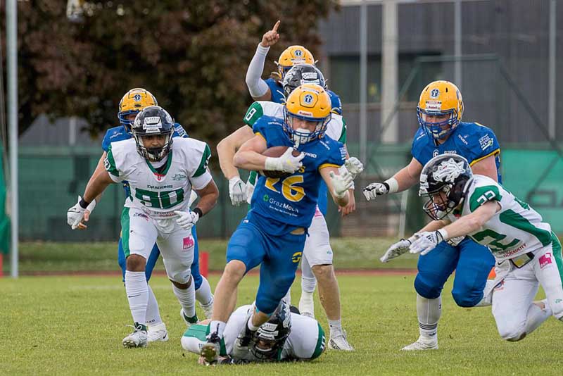 Der Kracher der Runde findet am Sonntag um 14 Uhr im SR Donaufeld im 21. Wiener Gemeindebezirk statt. Nicht nur konnten sowohl die Danube Dragons als auch die Graz Giants jeweils ihre ersten beiden Saisonspiele gewinnen, beide Teams legten bisher auch sehr starke Performances hin. Mit Alexander Reischl steht der bisher stärkste Quarterback der Liga aufseiten der Dragons, bei den Giants zeichnete sich RB Fritz Bleckmann bereits mehrmals aus.