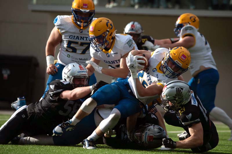 Das war beste Werbung für die Austrian Football League! Die Graz Giants haben im spektakulären Samstagabendspiel der 4. Runde bei den Swarco Raiders Tirol mit 28:27 die Oberhand behalten. Dank des dritten Saisonerfolgs sind die Steirer mit den Vienna Vikings und Danube Dragons gleichauf. Der Rekordmeister hatte das als Friday Night Game ausgetragene Wiener Derby nach Defense-Schlacht 13:7 für sich entschieden.